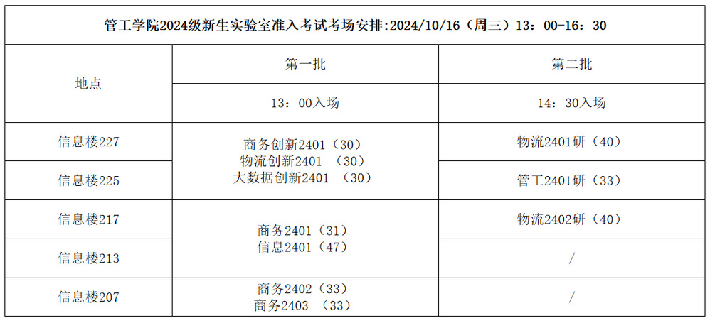 根据实验室安全工作部署,学院定于2024年10月16日(第5周周三)下午,在学院实验室进行2024级新生实验室准入考试。请各位同学认真学习《空姐 实验室安全手册》,了解学校相关规章制度,也可通过统一身份认证登录“实验室安全考试系统”进行在线学习和模拟测试,平台地址://labexam.kongjievip.com。请各位同学积极备考,按时到场参加考试。具体时间及场地安排如下: