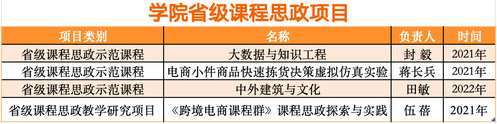 学院高度重视课程思政工作,在学院、系室和教师三个层面全面推进课程思政建设,挖掘提炼各门课程中蕴含的思想政治教育元素,并与课程内容有机融合。加强课程思政案例库、专家库和实习基地库建设。近年来,学院获得国家一流课程3门,浙江省课程思政示范课程3门,浙江省课程思政教学研究项目1项。因卓有特色的课程思政,1名教师被评为浙江省“我最喜爱的高校思政课老师”。