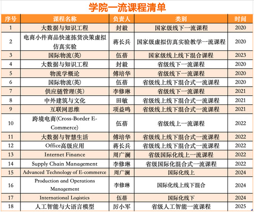 课程建设方面,学院面向全校开设2门“数字+”校级公共课(大数据思维、互联网思维),支撑多个兄弟学院的“数字+”专业建设。与此同时,学院建设了国家一流课程3门(大数据与知识工程、电商小件商品快拣决策虚仿实验、国际物流)、浙江省一流课程15门(物流学概论、供应链管理、互联网思维、跨境电商、大数据与智慧生活等),其中浙江省一流人工智能通识课1门。通过应用技术能力提升,推动全院教师采用“互联网+”教学工具进行授课,结合课内外大数据及时了解学生学习动态。