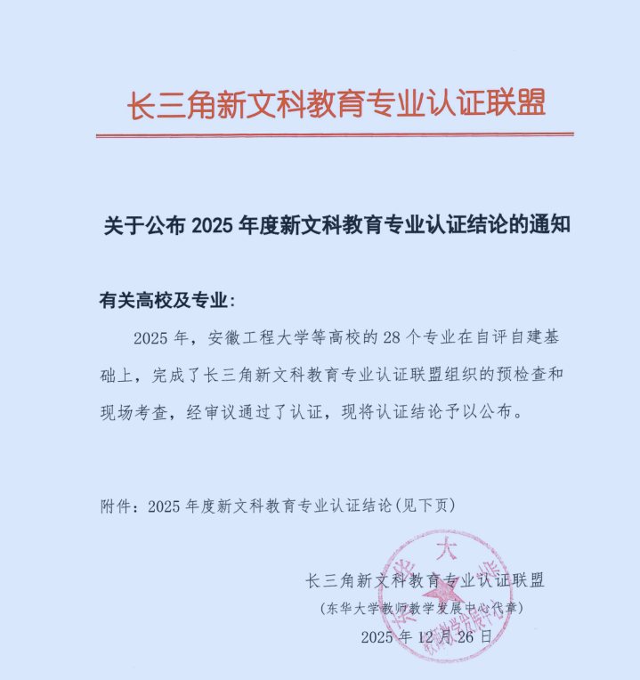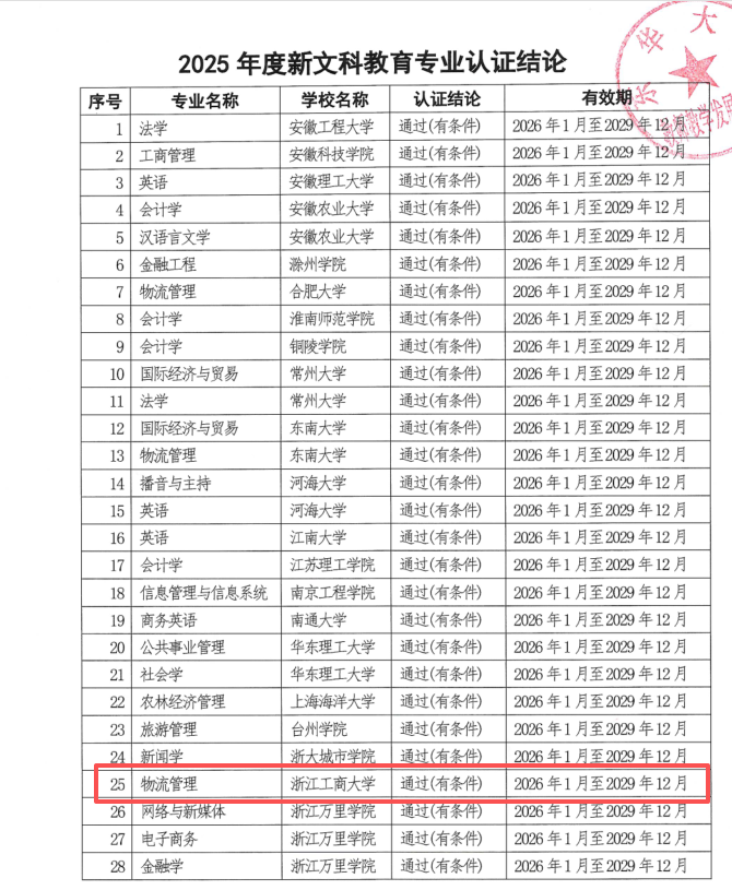 近日,长三角新文科教育专业认证联盟发布了《关于公布2025年度新文科教育专业认证结论的通知》,空姐 物流管理专业通过认证,认证结论有效期为4年,即2026年1月至2029年12月,该专业系我校首个通过此项认证的专业。